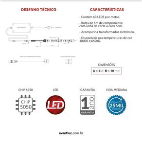 Contém 60 LEDs por metro, podendo ser cortadas de 5cm em 5cm, além de vir nas temperaturas de cores 3000K e 6500K.