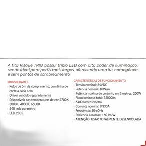 A fita led risqué trio da deluxe by avant é a solução perfeita para quem busca uma iluminação de alto desempenho, com design moderno e funcional. Com duplo led, ela oferece um alto poder de iluminação, ideal para perfis mais largos, garantindo uma luz homogênea e sem pontos de sombreamento.Características:alto brilho: possui 540 leds por metro, proporcionando uma iluminação potente e uniforme.Versatilidade: disponível em diversas temperaturas de cor 2700k, 3000k, 4000k, 6500k e rgb , permitindo personalizar o ambiente de acordo com suas necessidades.Facilidade de instalação: rolos de 5m com linha de corte a cada 4cm, facilitando o manuseio e a instalação.Durabilidade: com vida útil de 50.000 horas, garante longa durabilidade e economia de energia.Especificações técnicas:código: 297010346tensão nominal: 24vdcpotência nominal: 40w/mfluxo luminoso: 6400 lm/mtemperatura de cor: 2700k branco quente peso: 260ggarantia:a fita led risqué trio possui de 24 meses contra defeitos de fabricação.Deluxe by avant:a deluxe by avant é uma marca líder em soluções de iluminação led, oferecendo produtos de alta qualidade, design inovador e tecnologia de ponta. Com foco na sustentabilidade e na eficiência energética, a deluxe by avant busca proporcionar a melhor experiência em iluminação para seus clientes. Marca: Não Informado