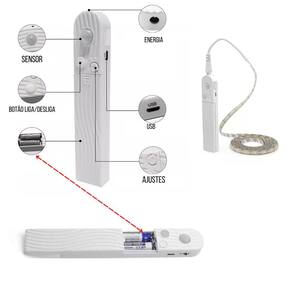 Fita de Led SMD 2835 Adesiva Flexível 3m Com Sensor De Presença Com 3 Modos IP65 Funciona A Pilhas Ou Com Fonte De 5V Cor: Branco Quente A Fita de Led flexível com sensor de presença/movimento é ideal para serem utilizadas em decorações em quartos, paredes, tetos, apartamentos, salões de festas, corredores, nichos, armários, espelhos, penteadeiras, guarda roupas, closets, escritórios, placas, letreiros, painéis, gabinetes, sancas, corrimãos, escadas, debaixo de camas, gessos e em vários locais com criatividade proporcionando uma iluminação agradável e elegante. Especificações do produto: - Material: Fita adesiva com proteção de silicone - Iluminação: LED SMD Modelo 2835 - Total de LED: 60 Leds por metro - 180 Leds no total - Alimentação: Pode ser utilizada 4 pilhas AAA ou uma fonte de energia DC-5v através de um cabo USB Tipo V8 Não acompanha nenhuma Pilha ou Fonte de Alimentação de 5v - Ângulo de Indução: Até 120º - Potência: 3w - classificação: IP65 - No controle vem acompanhada uma fita dupla face para ser fixada no local desejado onde o sensor é melhor posicionado. - Indicado para uso: Interno/Externo - Pode ser cortada a cada 17mm 1,7cm nos pontos indicados na fita - Distância de Detecção do Sensor de Presença: Até 3m - Peso: Aproximadamente 95g Gramas cada fita Manual rápido: - O controle possui 3 modos que será acionado no botão liga/desliga . Quando for escolhido algum dos modos de sensor, a luz apagará e já estará em funcionamento. 1- Com a imagem de um Sol o sensor funciona no claro e no escuro. 2- Com a imagem de uma Bolinha a luz fica ligada diretamente com o sensor desativado. 3 - Com a imagem de uma Lua o sensor somente funcionará no escuro, não acenderá se o lugar estiver com luz. - Também possui um botão de uma seta para cima que controla intensidade do brilho da luz da fita. - Procure um especializado para os cortes, emendas, escolha das fontes apropriadas de acordo com o tipo de projeto e para a instalação das fitas com segurança. - ATENÇÃO: A fita não deverá ser ligada diretamente na energia elétrica 110/220v sem uma fonte de 5v e nem cortada fora dos pontos indicados para não danificar o produto. Medidas da Fita: - Comprimento: 3 Metros - Largura: 0,8cm 8mm Itens inclusos: - 1 Fita de Led de 3 Metros - 1 Controle com sensor de movimento