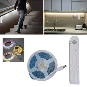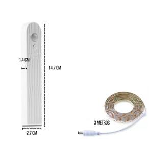 Fita de Led SMD 2835 Flexível Com Sensor De Presença Movimento De 3M Com 3 Modos De Iluminação Com Proteção IP65 De 5V Cor: Branco Morno A Fita de Led flexível com sensor de presença/movimento é ideal para serem utilizadas em decorações em quartos, paredes, tetos, apartamentos, salões de festas, corredores, nichos, armários, espelhos, penteadeiras, guarda roupas, closets, escritórios, placas, letreiros, painéis, gabinetes, sancas, corrimãos, escadas, debaixo de camas, gessos e em vários locais com criatividade proporcionando uma iluminação agradável e elegante. Especificações do produto: - Material: Fita adesiva com proteção de silicone - Iluminação: LED SMD Modelo 2835 - Total de LED: 60 Leds por metro - 180 Leds no total - Alimentação: Pode ser utilizada 4 pilhas AAA ou uma fonte de energia DC-5v através de um cabo USB Tipo V8 Não acompanha nenhuma Pilha ou Fonte de Alimentação de 5v - Ângulo de Indução: Até 120º - Potência: 3w - classificação: IP65 - No controle vem acompanhada uma fita dupla face para ser fixada no local desejado onde o sensor é melhor posicionado. - Indicado para uso: Interno/Externo - Pode ser cortada a cada 17mm 1,7cm nos pontos indicados na fita - Distância de Detecção do Sensor de Presença: Até 3m - Peso: Aproximadamente 95g Gramas cada fita Manual rápido: - O controle possui 3 modos que será acionado no botão liga/desliga . Quando for escolhido algum dos modos de sensor, a luz apagará e já estará em funcionamento. 1- Com a imagem de um Sol o sensor funciona no claro e no escuro. 2- Com a imagem de uma Bolinha a luz fica ligada diretamente com o sensor desativado. 3 - Com a imagem de uma Lua o sensor somente funcionará no escuro, não acenderá se o lugar estiver com luz. - Também possui um botão de uma seta para cima que controla intensidade do brilho da luz da fita. - Procure um especializado para os cortes, emendas, escolha das fontes apropriadas de acordo com o tipo de projeto e para a instalação das fitas com segurança. - ATENÇÃO: A fita não deverá ser ligada diretamente na energia elétrica 110/220v sem uma fonte de 5v e nem cortada fora dos pontos indicados para não danificar o produto. Medidas da Fita: - Comprimento: 3 Metros - Largura: 0,8cm 8mm Itens inclusos: - 1 Fita de Led de 3 Metros - 1 Controle com sensor de movimento