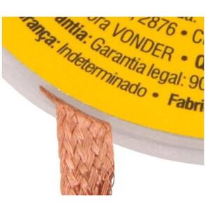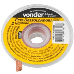 Fita malha Dessoldadora Cobre 3 mm x 1,5 m Vonder Conteúdo da Embalagem: 1 Rolo de fita/malha dessoldadora Indicada para absorver o excesso de solda nos reparos eletrônicos e/ou remover os resíduos de soldas anteriores no componente, visando efetuar a limpeza e permitir uma nova soldagem Fabricada com fios de cobre entrelaçados, que permite fácil absorção da liga de estanho, tornando mais rápido e eficiente o procedimento de dessoldagem Material:cobre Largura:3,0 mm Comprimento:1,5 m CDC : legal: 90 dias Ean: 7893946583378