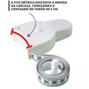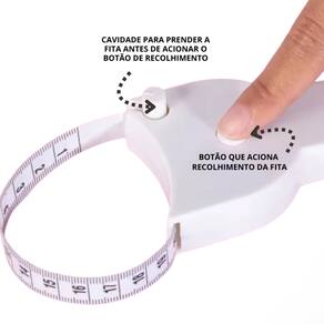 Retrátil (só apertar o botão) e com stop na medição(trava na medição feita)Cor: brancoTamanho da fita: 150cm (1,5 metros)Tamanho: 8,1 cm x 5,5 cm x 2 cmMaterial: ABS + PVC + MicrofibraOBS: A fita métrica começa medir à partir do 5cm devido o tamanho da circunferência total da base com a fita.