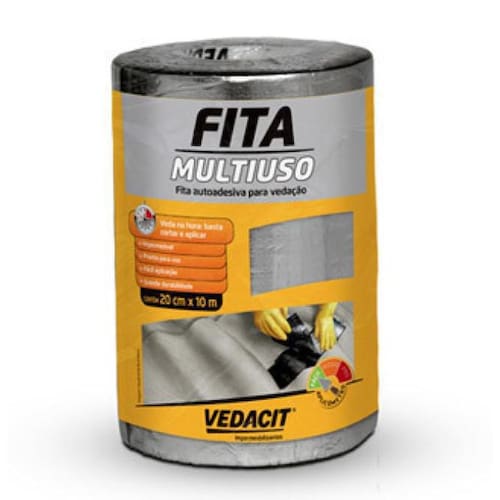 Vedacit fita multiuso para reparos é uma fita asfáltica impermeável, produzida à base de asfaltos modificados com polímeros e elastômeros, que apresenta excelente aderência a vários substratos. Possui estruturante não tecido resinado de poliéster que confere maior resistência e flexibilidade. A cobertura superficial de alumínio atua como barreira refletora dos raios solares e apresenta grande durabilidade. É de fácil aplicação, sendo um modo prático, rápido e eficaz de vedar imediatamente goteiras e infiltrações. Ficha técnica - Fonte do produto: 20 CM X 10 M - Unidades por pacote: 1 - PELICULA: ALUMINIO Ean: 7897321123968