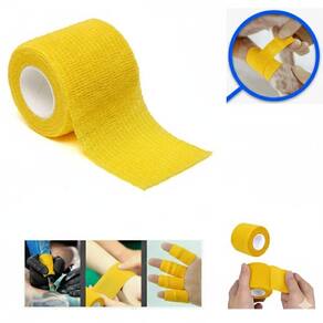 Esta bandagem é uma fita não adesiva que adere a si mesma, sem necessidade de pinos ou outras fitas para mantê-lo juntos. É ideal para aplicar compressão nos músculos lesionados, pois não adere à pele ou ao cabelo.
