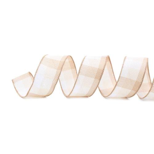 Fita aramada xadrez branco e bege. - Embalagem de Venda: 1 UN - Cor Predominante: BRANCO / BEGE - Material Utilizado: 100% Poliéster Instruções de Limpeza: Proibido levar à àgua.Não usar alvejante a base de cloro.Proibido usar secadora.Não passar Ref: Cromus: 1116931