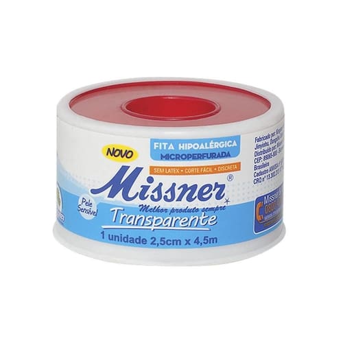 Fita Transparente Hipoalérgica Missner 2,5cm x 4,5m - Hipoalérgica - Microperfurada - Sem látex - Corte Fácil - Discreta - Para Pele Sensível Não machuca pele - Manter fora de umidade e calor - Fita transparente fosco, super discreto na pele, alta flexibilidade aos movimentos e de fácil corte. Seus furos permitem a respiração da pele. - Composição: Fita adesiva composta por filme termoplástico microperfurado e adesivo Acrílico hipoalergênico. - Indicação: fixação de curativos secundários, sondas, drenos, dispositivos de infusão intravenosa, cateteres, e outros procedimentos clínicos que exijam fixação, em regiões de pele sensível. Indicado para cirurgias estéticas devido ao produto ser mais discreto. Isento de látex de origem natural. Registro ANVISA: 80003300012 Homologação Anvisa: 10379860119 Marca: Não Informado Ean: 7896544900387