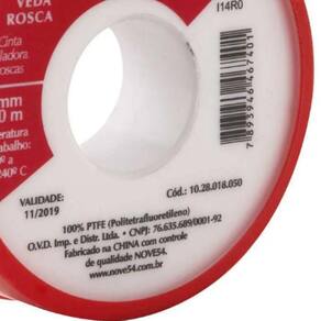 Fita Veda Rosca 18mmx50m Ptfe Teflon - Nove54 Conteúdo da embalagem 1 Fita veda rosca Aplicações e dicas de uso Indicada para vedação de conexões roscadas. Validade indeterminada Destaques e diferenciais Possui embalagem em estojo plástico que aumenta a vida útil do produto e facilita a aplicação DETALHES TÉCNICOS