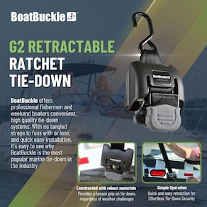 - BoatBuckle A G2 Stainless revoluciona o equipamento de barco de reboque com seu design inovador auto-retrátil e instalação permanente simples de um parafuso. Ideal para proteger seu barco durante o transporte, este sistema de amarração de popa retrátil é feito de aço inoxidável, garantindo durabilidade mesmo em ambientes de água salobra ou salgada.