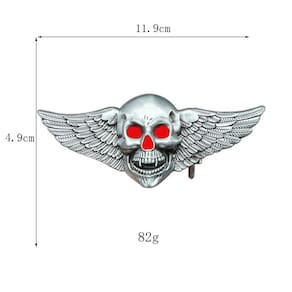 Material: liga leve Peso: 82 kg Tamanho: 11,9 x 4,9 cm Design exclusivo de caveira alada: apresenta uma caveira ousada com asas e olhos vermelhos, perfeita para quem quer uma aparência ousada e rebelde. Construção em liga de alta qualidade: feita de material de liga durável, garantindo a resistência duradoura e a aparência elegante da fivela. Ideal para estilos de rock e motociclistas: um acessório indispensável para motociclistas, entusiastas do rock ou qualquer pessoa que adote uma declaração de moda ousada e destemida. Detalhes intrincados: o design da caveira, combinado com os impressionantes olhos e asas vermelhos, torna essa fivela uma adição atraente a qualquer roupa. Serve para cintos padrão: projetados para caber na maioria dos cintos de 39 mm, oferecendo um ajuste seguro e elegante para roupas casuais, motociclistas ou com temas de rock.
