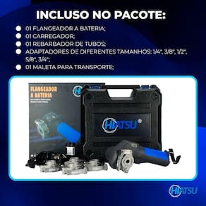 - 01 FLANGEADOR A BATERIA01 CARREGADOR01 REBARBADOR DE TUBOS01 MALETA PARA TRANSPORTE01 ABRAÇADEIRA 1/401 ABRAÇADEIRA 3/801 ABRAÇADEIRA 1/201 ABRAÇADEIRA 5/801 ABRAÇADEIRA 3/4