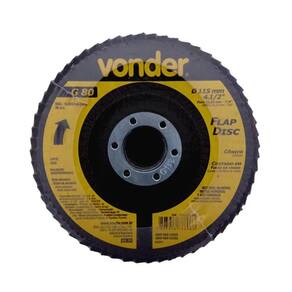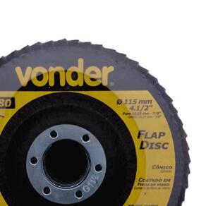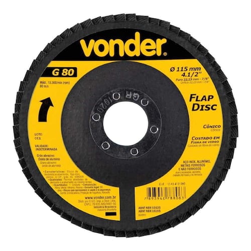 Flap Disco Cônico 4.1/2 Grão 80 C.Fibra - 1224412081 Disco permite atividades de desbaste e acabamento ao mesmo tempo, eliminando a troca de discos. Proporciona menor vibração e ruído comparado com o disco de desbaste convencional. Seu formato cônico permite um melhor aproveitamento do disco aumentando o rendimento.