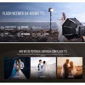 Com um design inovador, este Flash Neewer Q4 Estroboscópico 400WS TTL Wireless de Montagem Bowens é aquele tipo de equipamento que você percebe logo de cara que foi feito para quem leva fotografia a sério. Ele combina potência profissional com portabilidade, sendo compacto o suficiente para levar em qualquer produção, mas robusto para entregar iluminação confiável em estúdio ou externa.O Flash Estroboscópico Neewer Q4 vem equipado com Sistema Sem Fio de 2.4 GHz com alcance de até 100 metros, oferecendo liberdade total para disparar em diferentes situações. Seu número guia de 72 metros impressiona, e a Temperatura de cor de 5600K garante uma luz consistente e natural.Compatível com Canon E-TTL II, Nikon i-TTL e Sony TTL, esse Monolight Neewer Q4 oferece três modos principais: TTL, Manual e Multi Estroboscópico . Acompanha Bateria Recarregável de íons de lítio 2800 mAh / 21.6v permite até 400 disparos em potência máxima, com reciclagem super rápida de 0.01 a 1.2s. Isso significa que você pode fotografar sequências sem perder o ritmo.Outro detalhe que faz diferença: este Flash de Estúdio Neewer Q4 Strobe possui Lâmpada LED de modelagem de 30W ajuda na composição e visualização da cena antes do clique. E para não ficar limitado, ele traz o suporte de Montagem Bowens, permitindo usar uma grande variedade de modificadores de luz, como Softboxes, Snoots e Refletores.Na prática, é um Flash Estroboscópico Neewer Q4 que entrega velocidade, precisão e versatilidade. Seja congelando movimentos em 1/8000s, criando efeitos com estroboscópio de até 100 disparos 199 Hz ou aproveitando a sincronização da 1 e 2 cortina, o Q4 dá conta de produções criativas sem complicar sua vida.Principais Características: Potência de 400W Número guia 72m ISO 100, 200mm 3 Modos de flash: TTL, Manual e Multi Estroboscópico Compatível com Canon E-TTL II, Nikon i-TTL e Sony TTL Sincronização em alta velocidade HSS até 1/8000s Duração de flash: 1/209 a 1/10.989 segundos Possui um Reciclagem rápida de 0.01 a 1.2s Bateria de até 400 disparos em potência máxima LED de modelagem 30W / 5600K / CRI 95+ Sistema Sem Fio 2.4g 32 canais, 5 grupos Ventilador silencioso integrado e suporte a atualização de firmware via USB-C Montagem Bowens para modificadores de luz, como Softboxes, Snoots e Refletores. Acompanha Alça Handle, Refletor e Case de transporte e armazanamento. Compatível com Dispadores Neewer QPRO e com Sistema Godox X Sistemas e X não podem ser simultaneamente