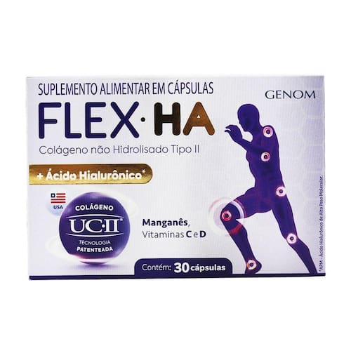 Flex-HA é um suplemento alimentar em cápsulas voltado para a saúde articular. Sua composição possui colágeno UC-II® com Ácido Hialurônico, vitamina D, C e Manganês.