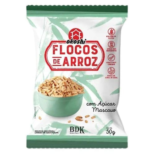 Flocos de arroz integral com açúcar mascavo okoshi 50g O flocos de arroz integral com açúcar mascavo okoshi é um snack artesanal e delicioso. Leva apenas 2 ingredientes, o arroz integral orgânico e o açúcar mascavo.