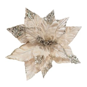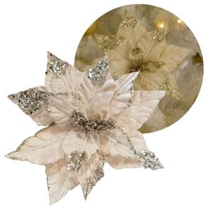 Adicione requinte e brilho à sua decoração natalina com esta flor bico de papagaio em veludo champanhe luxo, ricamente decorada com bordas em glitter dourado e lantejoulas brilhantes. Seu design sofisticado transforma qualquer arranjo, árvore ou guirlanda em uma peça elegante e marcante.