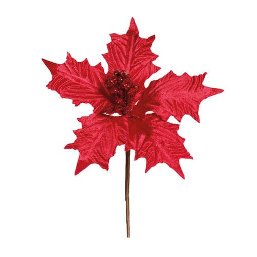 Poinsetia vermelha - Cor Predominante: VERMELHO - Materia Prima: 60% Poliéster, 30% Plástico, 5% Papel e 5% Metal - Instruções de Limpeza: Limpar apenas com pano macio e seco. - Destaques: Porque nenhuma decoração de Natal tradicional é completa sem poinsétias! Para dar um toque final ou até mesmo em grande quantidade para conseguir um efeito UAU, estas lindas flores são essenciais!