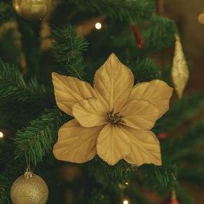 A flor magnólia natalina em veludo dourado luxo é o enfeite perfeito para levar sofisticação e brilho à sua decoração de Natal. Seu acabamento aveludado em tom dourado elegante é realçado por bordas com glitter, que garantem um efeito luminoso encantador quando combinada com a iluminação da árvore ou arranjos.