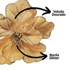 Transforme sua decoração natalina em um verdadeiro espetáculo com esta flor magnólia dourada em veludo com glitter, que une luxo, brilho e sofisticação em cada detalhe.