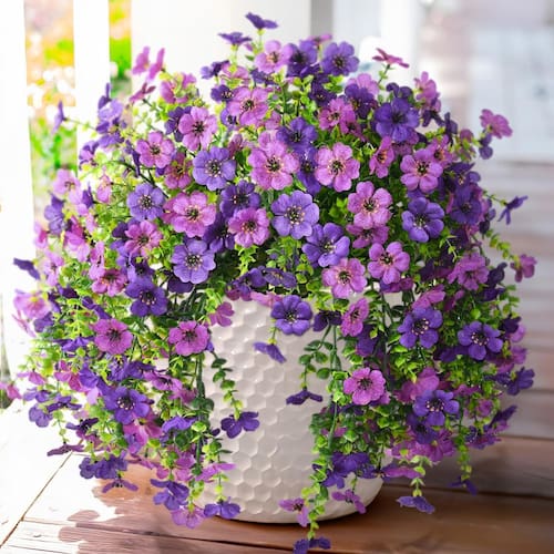 - Flores artificiais realistas: 2 feixes de plantas artificiais ao ar livre adequadas para pendurar e arranjos de plantadores de varanda. Cada flor falsa é cheia de flores e folhas. Estas flores artificiais cuidadosamente criadas para elevar o apelo estético de qualquer espaço enriquecem sua vida cotidiana