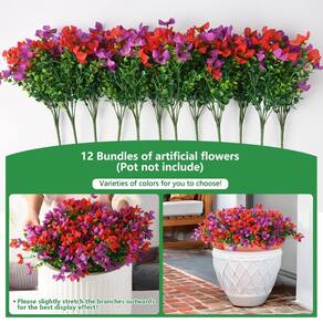 Flores artificiais para decoração de primavera ao ar livre, 12 pacotes de plantas falsas, flores de seda, resistentes a UV, para decoração de jardim, varanda, pátio, decoração - ?O pacote inclui?12 ramos de buquê de plantas artificiais de flores artificiais, no qual os ramos e flores são destacáveis! Livre para você montar e combinar (pote não incluído) - ?Alta aplicabilidade?Os ramos do nosso buquê de flores falsas são embutidos com arame, para que possam ser dobrados e moldados à vontade, fáceis de fazer você mesmo, adequados para todos os tipos de vasos de flores e plantadores - ?Beleza eterna?As flores artificiais Homsunny para uso ao ar livre não precisam de manutenção! Sem preocupações com irrigação! Nunca desbota. Resistente a UV e intempéries! Beleza florescente em todas as estações - ?Qualidade superior?As pétalas são feitas de seda de alta qualidade, as folhas de eucalipto são feitas de plástico, cores brilhantes e formas realistas, adicionando cores naturais vibrantes à sua casa - ?Solução perfeita para decoração de casa?Nossas flores artificiais são adequadas para qualquer lugar, todas as cenas! Como jardins, varandas, pátios, varandas, etc., embelezam perfeitamente sua casa