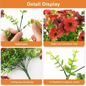As plantas suspensas artificiais são feitas de material de seda confiável, as folhas de eucalipto são feitas de plástico forte e as hastes são feitas de plástico e arame de ferro, oferecendo suporte robusto e flexibilidade. O pacote que você recebeu contém duas flores penduradas, que você pode ajustar e combinar de acordo com suas preferências pessoais