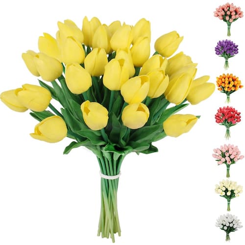 Material de alta qualidade. Estas flores de tulipas artificiais são feitas de material de poliuretano de alta qualidade que parece tulipas cheias e frescas. As hastes de flores artificiais têm uma haste de arame flexível. Facilmente dobrada, cortada. 30 tulipas de tamanho perfeito. Este pacote de flores artificiais inclui 30 tulipas. Uma variedade de cores vibrantes para sua escolha. As tulipas falsas têm cerca de 49 cm de altura. Folhas e haste ajustáveis. O caule e as folhas das tulipas de látex têm fio de aço dentro. As folhas podem ajustar a forma e não deforma facilmente. Você pode usá-lo ano após ano. Sensação de toque real. Estas flores artificiais para decoração são autênticas, com sensação de toque real, cores vivas e aparência fresca. As tulipas de flores artificiais são a melhor escolha se as pessoas forem alérgicas a flores. Amplamente utilizado. Ótima ideia de presente para mãe, amigos ou como presente de Natal. Perfeito para decorar sua casa, loja, mesa de festa, buquê, decoração de casamento ou como um belo arranjo de peça central. - Material de alta qualidade: esta tulipa artificial é feita de material de poliuretano de alta qualidade que parece tulipas cheias e frescas. O caule de flor falsa tem uma haste de arame flexível. Facilmente dobrada, cortada. - 30 tulipas de tamanho perfeito – Este pacote de flores artificiais de tulipas inclui 30 tulipas. Uma variedade de cores vibrantes para sua escolha. As tulipas de flores têm cerca de 34 cm de altura. - Folhas e haste ajustáveis – o caule e as folhas das tulipas falsas têm fio de aço dentro. As folhas de flores artificiais podem ajustar a forma e não deforma facilmente. Você pode usar flores artificiais ano após ano. - Sensação de toque real – Estas tulipas falsas são autênticas com sensação de toque real, cores vivas e aparência fresca. As flores de tulipas são a melhor escolha se as pessoas forem alérgicas a flores. - Amplamente utilizado: ótima ideia de presente para mãe, amigos, buquê de flores para casamento ou como presente de Natal. Perfeito para decorar sua casa, guirlanda de porta da frente, loja, mesa de festa, buquê, primavera, verão, decoração de páscoa, decorações de páscoa para casa, brunch de Páscoa, presentes de Dia das Mães, Dia das Mães, decoração de casamento, decoração de Natal, decoração de Halloween ou como um belo arranjo de peça central.