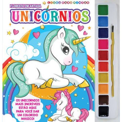 Os unicórnios aguardam por suas cores para deixar a floresta encantada ainda mais linda acompanha aquarela com 10 cores e pincel para completar a diversão.