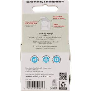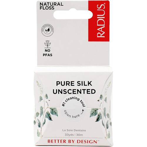 O fio dental de seda natural RADIUS é feito de seda 100% pura e revestido com cera de candelila natural, proporcionando um deslizamento suave entre os dentes. Este fio dental é biodegradável e livre de aditivos sintéticos, o que o torna uma escolha ecológica para o cuidado bucal diário. Cada pacote contém seis caixas individuais, cada uma com 33 metros de fio dental, totalizando 198 jardas. A embalagem é livre de plástico e reciclável, alinhando-se às práticas de vida sustentável.