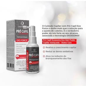 O Pró Capil Exossoma Fluido Capilar Antiqueda 50ml é um tratamento avançado e concentrado que combina biotecnologia de ponta com ativos naturais e essenciais para combater a queda capilar, fortalecer os fios e estimular o crescimento saudável. Sua fórmula leve e de rápida absorção atua diretamente no couro cabeludo e nos folículos, promovendo uma verdadeira renovação capilar desde a raiz. Ideal para quem sofre com queda de cabelo, fios enfraquecidos ou sinais de envelhecimento capilar, o fluido entrega resultados visíveis com uso contínuo e eficaz.Características e Benefícios:– Ativa o crescimento dos fios– Reduz a queda capilar– Fortalece o folículo capilar– Reduz o aparecimento de fios brancos– Protege contra o envelhecimento capilarAtivos:– Exossoma– Capilia Longa– Peptídeos de Cobre– Wisegrade– Complexo 15 Amino-Minerais– Niacinamida– Alecrim– Biotina– Pantenol B5Modo de usoCom os cabelos limpos e secos ou levemente úmidos, aplique o fluido diretamente no couro cabeludo, especialmente nas áreas com queda ou afinamento dos fios.Massageie suavemente com as pontas dos dedos por alguns minutos para favorecer a absorção.Não é necessário enxaguar. Utilize uma vez ao dia, preferencialmente à noite