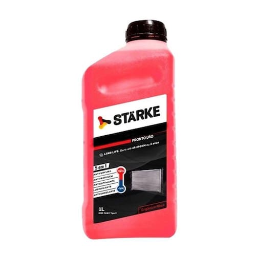 A Solução Arrefecedora Pronto Uso Starke possui formulação balanceada à base de glicóis e inibriadores de corrosão orgânicos qu foram desenvolvidos com alta tecnologia para oferecer maior proteção ao sistema de arrefecimento de motores endotérmicos de motocicletas, automóveis, utilitários, caminhões, maquinas agricolas e motores estacionários. Quando utilizado corretamente protege por até 2 anos ou 60.000km.