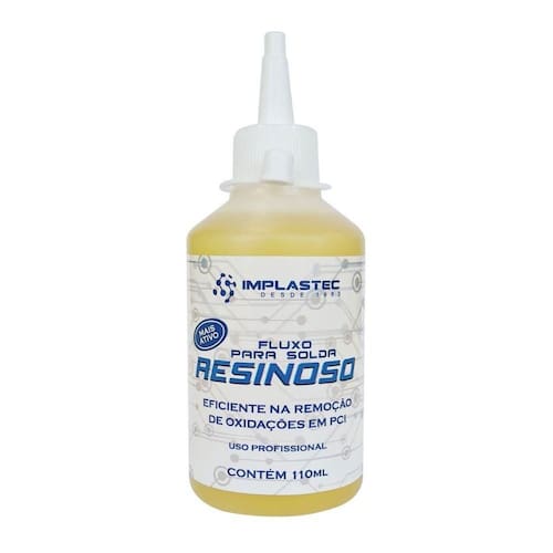 Fluxo ResinosoO Fluxo Resinoso Implastec por ser mais ativo, atua de forma mais incisiva na remoção de oxidações em PCI, além de melhorar a molhabilidade do metal na em que se deseja soldar.Principais AplicaçõesSoldagem pelo processo de estanhagemManuseio e Método de AplicaçãoAplique o Fluxo Resinoso Implastec nos pontos a serem soldados, aqueça a ilha de soldagem e efetue a solda do a limpeza da placa eletrônica com o Álcool Implastec.ArmazenagemArmazenar o produto vedado, longe do calor, em seco, ao abrigo da luz, bem ventilado, e em temperatura ambiente.Mantenha o produto em sua embalagem . Não reutilizar a embalagem vazia.ObservaçõesAs informações e dados contidos neste boletim correspondem aos nossos conhecimentos atuais coligidos por pessoal técnico capacitado e . Devem ser tomados como orientação e não como especificação garantida. Em qualquer caso de uso, o cliente deverá testar o desempenho contando com informações que possamos fornecer. Indicações de uso não são sugestões para se infringir patente ou legislação. Uma vez que não temos controle sobre o uso por terceiros, nossa responsabilidade se limita apenas ao nosso produto.