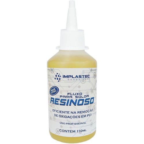Fluxo Resinoso 110ml Fluxo Resinoso O Fluxo Resinoso Implastec por ser mais ativo, atua de forma mais incisiva na remoção de oxidações em PCI, além de melhorar a molhabilidade do metal na em que se deseja soldar.