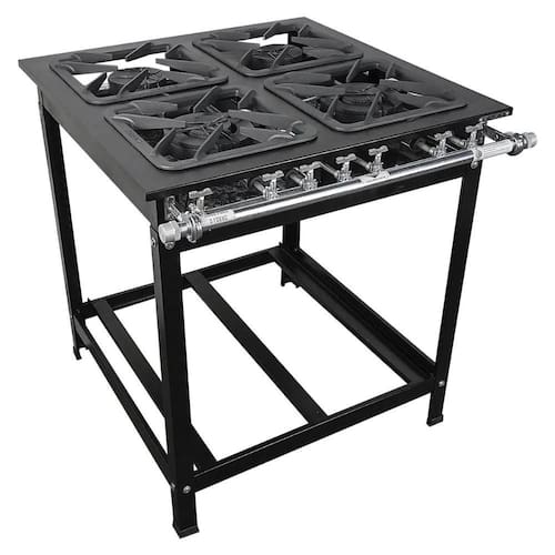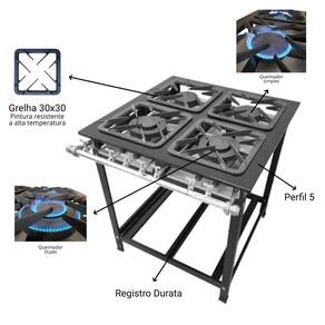 Características Técnicas: Funcionamento a gás GLP baixa pressão Estrutura em aço carbono com pintura a pó eletrostática Espessura 0,9mm (Chapa 20) Tubo de alimentação de gás de 1" 1 Grelha de ferro fundido 30x30 Registro regulador Palito Durata Consumo de gás queimador simples: 0,175kg/h Totalmente desmontável para facilitar o transporte e armazenamento Queimador simples: 130mm Queimador duplo: 175mm