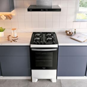 O **puxador em alumínio escovado**, além de ergonômico, dá um toque a mais de sofisticação no design. A **prateleira deslizante** torna ainda mais fácil colocar e retirar suas receitas com total praticidade. O **visor amplo** do forno permite acompanhar o preparo sem precisar abrir a porta, e o acabamento **Limpa Fácil** deixa a limpeza ainda mais rápida e descomplicada.