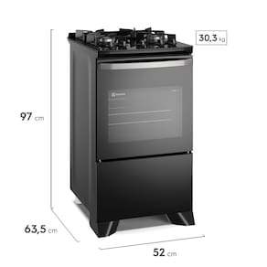 O forno ainda tem 2 prateleiras, para você fazer mais preparos ao mesmo tempo, acendimento com ignição rápida, fácil e segura e lâmpada que facilita a visualização interna.