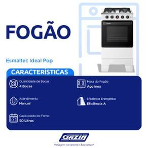 Fogao 4b Esmaltec Ideal Pop S/acend - 0104002938 Forno: B Tipo de gás: GLP Potência: 8,85 kW Volume do forno: 50 litros Outras informações : 12 meses Origem: Nacional Dimensões Altura: 88 cm Largura: 47 cm Profundidade: 57,6 cm Peso: 16,8 kg Cor: BRANCO - Voltagem: SEM VOLTAGEM DESCRIÇÃO Mesa de aço inox com espaldar. Trempes duplas em aço esmaltado: mais facilidade de limpeza. Pés retos de fácil encaixe: mais altos, fortes e seguros. Puxador mais resistente, robusto e ergonômico. Forno Limpa Fácil. 1 prateleira ajustável. Porta do forno em vidro total. Vidro interno removível. Acendimento manual. Queimadores: 1 família e 3 pequenos. Clássificação: Mesa: A Marca: Não Informado Ean: 7899081701462