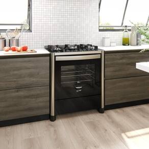 O forno tem capacidade interna de 110 litros, conta com vidro duplo, grill elétrico e iluminação interna, facilitando o preparo de assados com maior segurança. Além disso, o acabamento em esmalte easy clean permite uma limpeza mais prática.