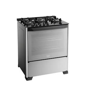 Design moderno com frente em vidro espelhado, mesa de vidro top control, acendimento automático, grades de ferro fundido com 6 pontos de apoio - que proporcionam maior segurança e firmeza para as panelas, bordas laterais em inox, puxador amplo e ergonômico e pés robustos.