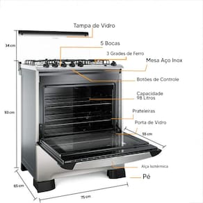 O forno amplo com capacidade de 98 litros permite preparar grandes assados com facilidade. Ele conta com duas prateleiras, sendo uma ajustável e outra deslizante, oferecendo maior versatilidade para diferentes tipos de receitas.