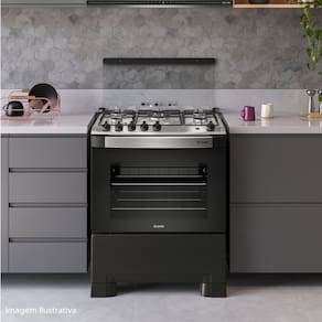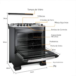 O acendimento automático total facilita o uso, funcionando tanto na mesa quanto no forno. As grades em ferro fundido proporcionam mais estabilidade e segurança para as panelas, enquanto os manípulos removíveis tornam a limpeza muito mais prática.