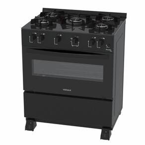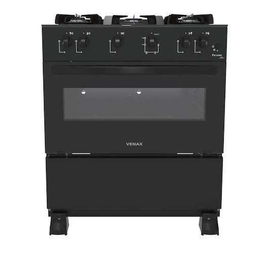 Tipo: Fogão de Piso Acendimento: Automático Queimadores: 3 Grandes e 2 Médios Trempe dos Queimadores: Individual Esmaltada Mesa Queimadores: Vidro Preto Base das Trempes: Esmaltada na cor Preta Botões: Removíveis Válvula de Segurança: Sim Luz no Forno: Não Prateleiras no Forno: Uma Regulável Revestimento do Forno: Esmalte Easy Clean Temperatura: 5 posições de 180C Até 290C Função Grill: Não Timer Grill: Não Timer Gás: Não Espeto Giratório: Não Bandeja Coletora de Resíduos: Não Porta Removível: Não Porta do Forno: Vidro Panorâmico Vidro Duplo na Porta: Sim Puxador da Porta: Aço na Cor Branco Estufa: Não Entrada de Gás: Lado Esquerdo Visto de Frente Cores das Laterais: Preto Fosco Marca: Venax