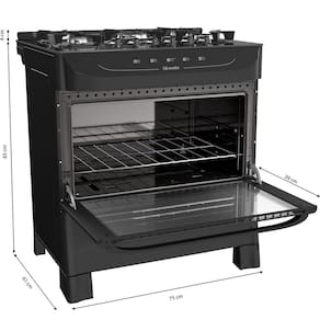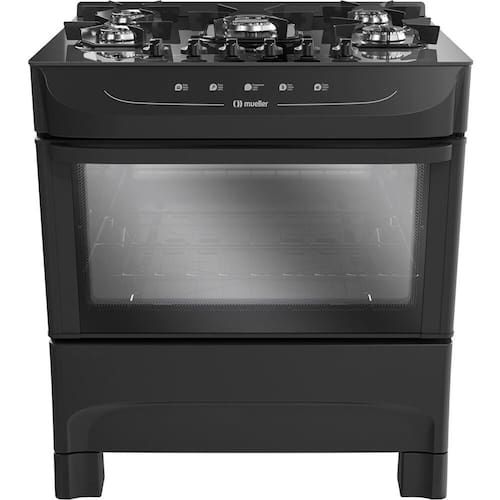 Caracteristicas: Marca: Mueller Modelo: MFV5BB Tipo de fogao: Piso Tipo: A gas Tipo de gas: GLP -conversivel para GN- Bocas: 05 Acendimento: Automatico total Queimadores familia: 2000 watts Queimador do forno: 2600 watts Queimadores medios: 1700 watts Material dos queimadores: Aco esmaltado Iluminacao interna: Nao Mesa: De vidro temperado Botoes: Removiveis Capacidade do forno: 82 litros Porta do forno: Vidro Temperatura minima do forno: 170C Temperatura maxima do forno: 290C Acabamento: No interior do Forno: Total Clean. Puxadores: 01 puxador em aco Grade: 5 grades de aco esmaltado individuais com 6 pontos de apoio Grades individuais: Sim Prateleiras: Uma grade ajustavel em dois niveis de altura Protecao termica traseira: Sim Classificacao Energetica: A Queimador ultra chama: 3700 Watts Botijao: P13 Valvula de seguranca: Sim