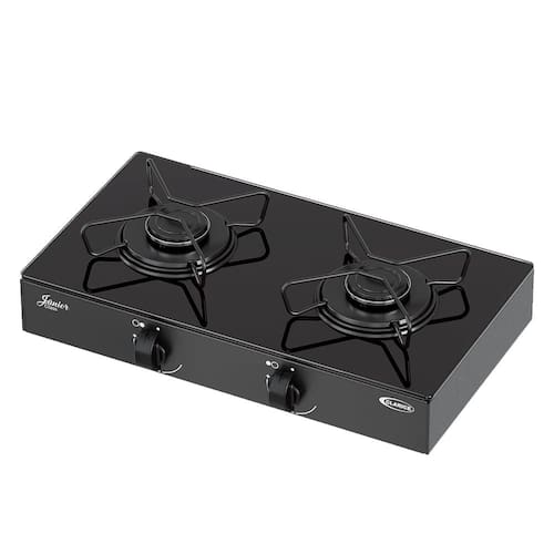 Fogão a gás portátil Clarice Junior com 2 bocas, mesa de vidro temperado, acendimento automático, queimadores estampados e trempes esmaltadas. Design moderno e fácil de limpar.Tipo