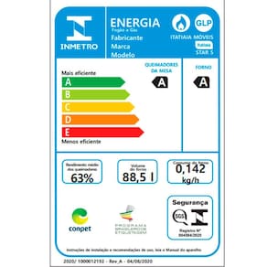 Caracteristicas do produto: Modelo: Star NG Tipo de fogão: Piso Tipo: A gás Tipo de gás: GLP -conversível para GN- Bocas: 05 Entrada do gás: Lado direito visto de frente Acendimento: Automático Potência do forno: 2,4 kW Mesa: Aço brilhante Trempes: Arame redondo Forno: Com acabamento Limpa Fácil Capacidade do forno: 88,5 litros Puxadores: Aço pintado Classificação Energética: A Consumo de gás: 0,142 kg/h Certificação Inmetro: 004584/2020 Atenção: A conversão de gás estará sujeita à aprovação de orçamento. A alteração das características do produto poderá ocasionar a exclusão da garantia de fábrica.