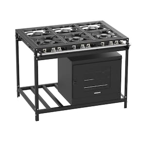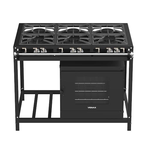 Tipo: Fogão industrial Marca: Venax Acendimento: Manual Queimadores: 3 Queimadores duplos(150mm) e 3 queimadores simples(120mm) Espalha chama: Ferro fundido Trempe dos queimadores: Ferro fundido(300x300mm) Mesa dos queimadores: Aço revestido com pintura eletrostática Perfil da mesa: Estilo "U" (60mm) Bandeja coletora de resíduos: Sim Botões: Metálicos Forno: Sim Prateleira do forno: 1 Regulável Revestimento do forno: Esmalte limpa fácil Isolamento do forno: Lã de vidro Termômetro no forno: Não Porta do forno: Aço com visor de vidro Puxador da Porta: Aço com baquelite Estrutura do fogão: Aço revestido com pintura eletrostática Entrada de gás: Dupla(reversível) Medidas do produto: Altura 84cm - Largura 107cm - Profundidade 84cm