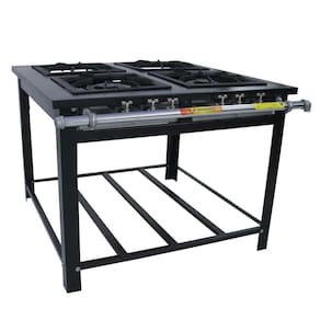 - Gás GLP baixa pressão; - Tudo distribuidor (varão) de 1" com acabamento cromado, possuindo tampão e entrada de gás reversível; - Queimadores simples (120mm de diâmetro) e duplos (180mm - com controle individual das chamas) em ferro fundido, fixos por encaixe; - Queimadores de alto rendimento, possuindo potência de 3.021 kcal/h no modelo simples e 5.586 kcal/h no modelo duplo; - Totalmente desmontável, facilitando o transporte e armazenagem; - Corpo e mesa de aço carbono super resistente, com acabamento em pintura pó eletrostática, com base fosfatizada, grelha de ferro fundido de 40x40cm e mesa com perfil 10cm; - Todos os fogões, a partir de 2 queimadores, são produzidos com tampão para posterior colocação do forno; - Registro cromado 1/4"; - Bandeja coletora em aço galvanizado; - Limpeza e manutenção facilitadas, pois os queimadores são encaixados, facilitando a remoção; - Equipamento para uso industrial e profissional.