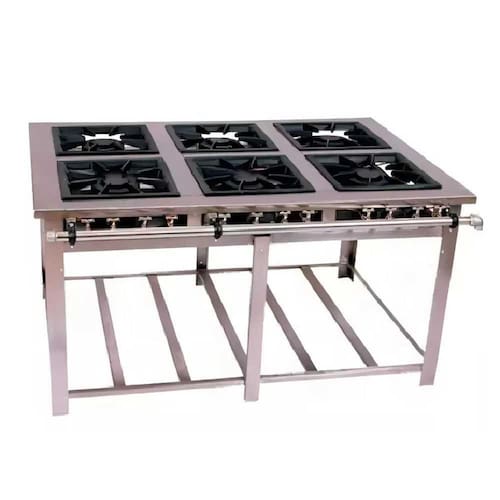 - Fogão com 6 queimadores (3 queimadores duplos e 3 queimadores simples); - Gás GLP baixa pressão; - Estrutura totalmente em aço inoxidável, grelha 40x40cm em ferro fundido e mesa com perfil de 10cm; - Tubo distribuidor (varão) de 2" cromado, possuindo tampão e entrada de gás reversível; - Registro cromado de 1/4"; - Totalmente desmontável para facilitar o transporte e armazenamento; - Modelos produzidos com tampão no distribuidor, para posterior colocação de registro para forno; - Nos modelos a partir de 4 queimadores, podem ser produzidos para centro de cozinha, exceto modelos em linhas e módulos; - Grelhas e queimadores em ferro fundido, queimadores simples com 120mm de diâmetro e duplos de 180mm; - Queimadores de alto rendimento, possuindo potência de 1.938kcal/h no modelo simples e 4.959 kcal/h no modelo duplo e modelo de alto rendimento lateral com potência de 8.744 kcal/h, utilizado nos fogões de 5 e 7 queimadores; - Queimador com encaixe de fácil remoção para limpeza e manutenção; - Fácil regulagem de entrada de oxigênio; - Limpeza e manutenção facilitados, pois os queimadores são encaixados facilitando a remoção; - Equipamento para uso industrial e profissional.