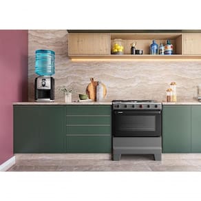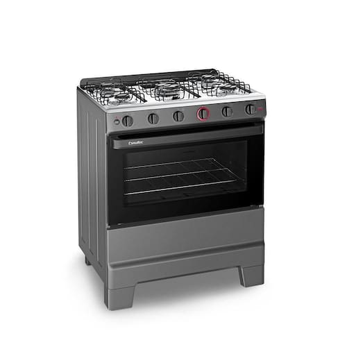 As trempes duplas com mais apoios proporcionam estabilidade superior, mesmo com panelas acendimento automático, o uso é mais ágil e prático. O forno com 84 litros de capacidade, equipado com porta em vidro total, vidro interno removível e prateleira ajustável, amplia as possibilidades no preparo de receitas para toda a família.