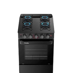Quantidade de queimadores: 4 | Alimentação: A gás | Mesa: Vidro | Cor: Preto | Tipo: De piso | Forno com acabamento autolimpante: Não | Voltagem: Bivolt | Luz no forno: Não | Acompanha lâmpada: Não