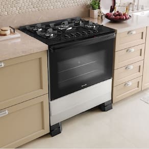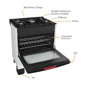 Com cinco queimadores, incluindo chama tripla, oferece potência ideal para preparar desde refeições rápidas até pratos elaborados. O acendimento automático e os botões removíveis proporcionam mais praticidade e segurança no uso diário.